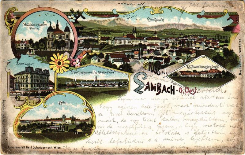 1900 Lambach, Wallfahrtskirche Paura, Sparkasse, Stift, Flachsspinnerei in Stadtl-Paura, K.k. Staats Hengsten Depot / church, savings bank, monastery, flax spinning mill, stallion depot. Kunstanstalt Karl Schwidernoch Art Nouveau, floral, litho (tear)