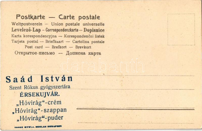 Érsekújvár, Nové Zámky; Saád István Szent Rókus gyógyszertárának reklámja a képeslap hátoldalán "Hóvirág krém, szappan, púder" / pharmacy advertisement on the backside. litho