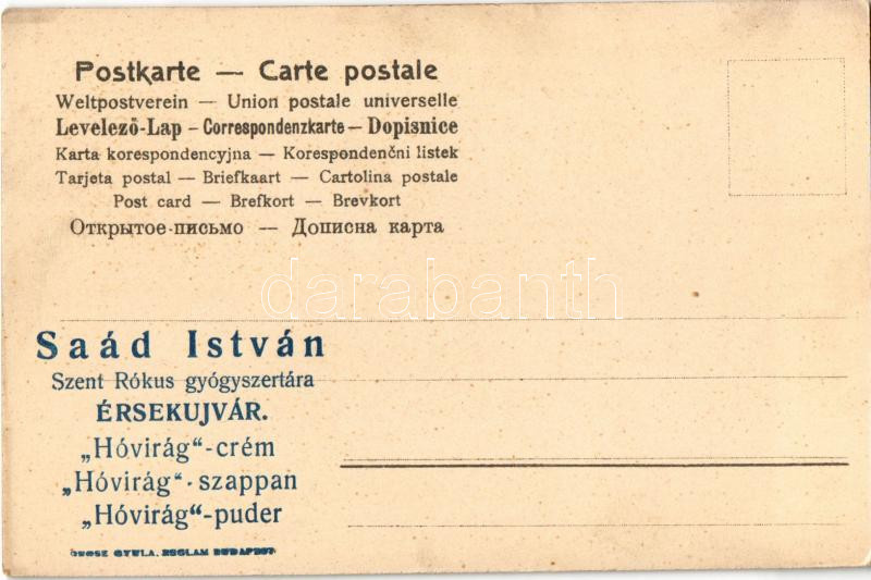 Érsekújvár, Nové Zámky; Saád István Szent Rókus gyógyszertárának reklámja a képeslap hátoldalán "Hóvirág krém, szappan, púder" / pharmacy advertisement on the backside. litho