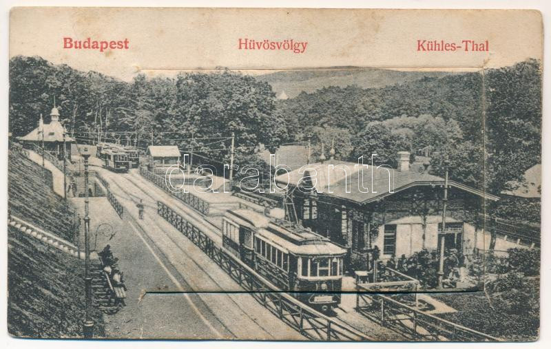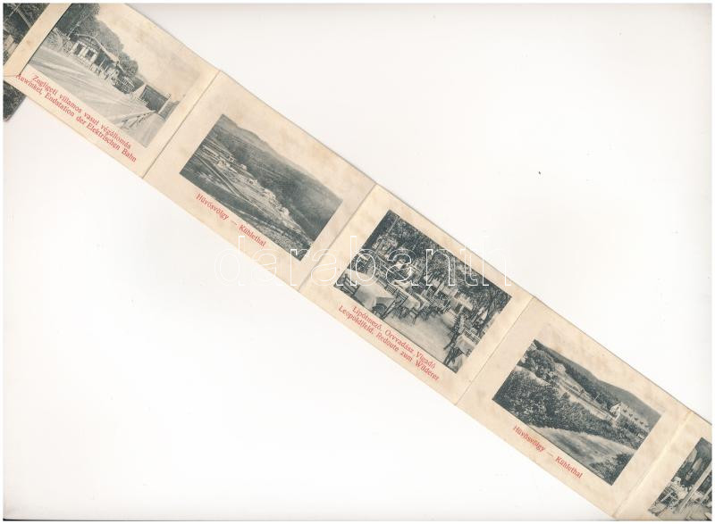 1907 Budapest II. Hűvösvölgy, villamos végállomás. Leporellolap 10 kis képpel (Zugligeti villamos vasúti végállomás, híd, Lipótmező Orvvadász vigadó, Balázs, Fácán és Disznó-fej vendéglő kertjei, Istenhegy és Normafa, Máriaremetei új templom) (Rb)