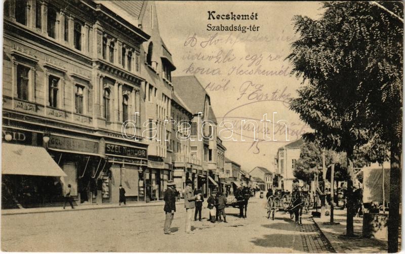 1912 Kecskemét, Szabadság tér, Szél Nándor üzlete, lovaskocsik. Fekete... https://www.darabanth.com/de/454-Fernauktion/454.0/Ansichtskarten/Ungarn~1000005/1912-Kecskemet-Szabadsag-ter-Szel-Nandor-uzlete-lovaskocsik-Fekete-Schwartz-Soma-kiadas~II2184585