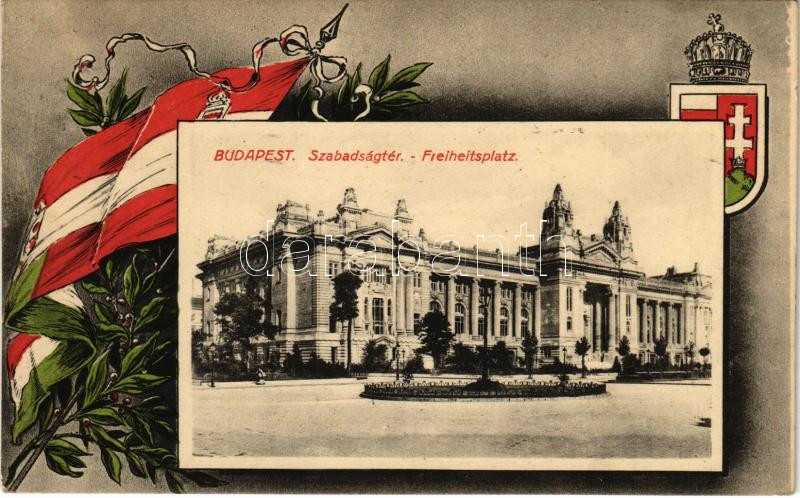 Beschreibung: 1915 Budapest V. Szabadság tér, Tőzsdepalota. Szecessziós magyar zászlós és címeres keret