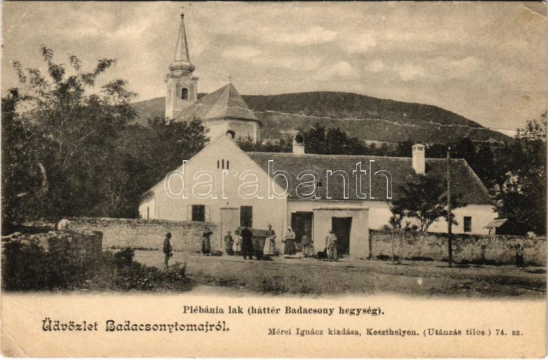 Beschreibung: Badacsonytomaj, Plébánia lak és templom (háttérben a Badacsony hegység). Mérei Ignác 74. (fa)