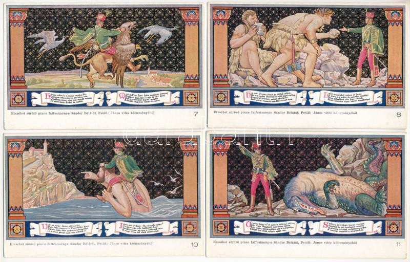 Budapest V. Egyetem utca 5. Erzsébet Királyné Szálló étterem és söröző pince, Sándor Béla falfestménye Petőfi Sándor János vitézéből - 12 db régi képeslap, a teljes sorozat