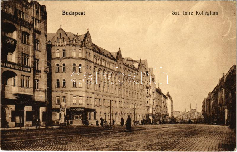 Budapest XI. Budai Szent Imre Kollégium a Horthy Miklós úton (ma Bartók Béla út 17-19.), Szent Gellért Gyógyszertár, villamos, Iskola Akadémiai Előkészítő Tanfolyam