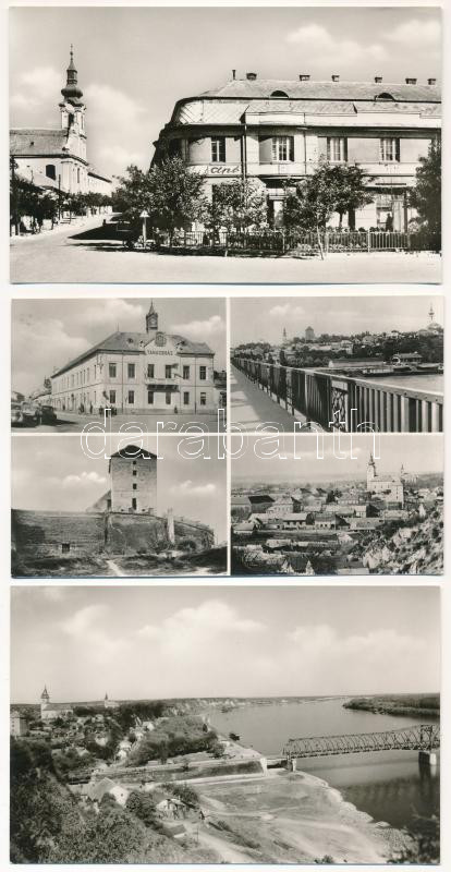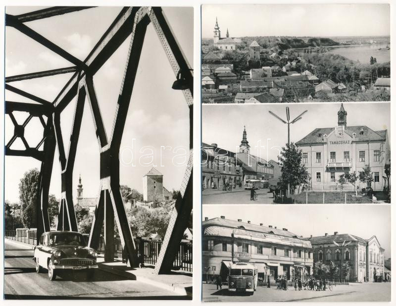 Beschreibung: Dunaföldvár - 5 db modern Képzőművészeti Alap képeslap (Duna híd, vár, autó, Béke tér, templom, cipő üzlet, tanácsház, Népbolt, buszok)