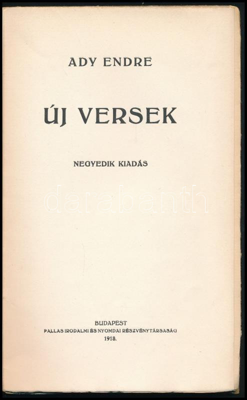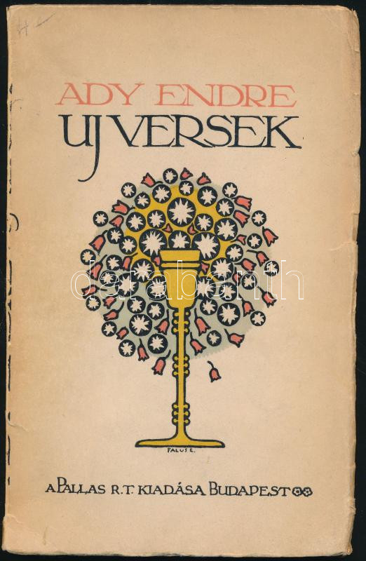 Ady Endre: Uj versek. Bp., 19189., Pallas, 83+1 p. Negyedik kiadás. A borító Falus Elek munkája. Nagy Sándor egészoldalas rajzával. Kiadói papírkötés, szakadt borítóval.