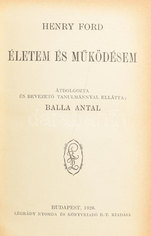 Henry Ford: Életem és működésem. Átdolgozta és bevezető tanulmánnyal ellátta: Balla Antal. Bp., 1926., Légrády, 1 t. + 291 p. Kiadói egészvászon-kötés, kissé kopott borítóval, benne újságcikkekkel.