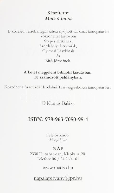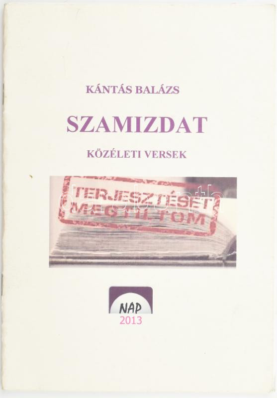 Kántás Balázs: Szamizdat. Közéleti versek. Dunaharaszti, 2013., Nap, 14 p. Kiadói papírkötés. "A kötet megjelent bibliofil kiadásban, 50 számozott példányban." De ez számozatlan példány.