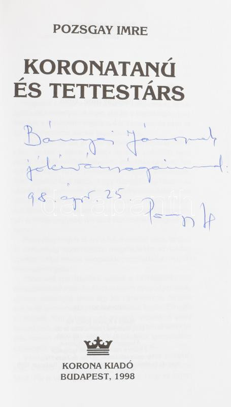 Pozsgay Imre: Koronatanú és tettestárs. Bp., 1998, Korona. Első kiadás. Kiadói papírkötés. A szerző, Pozsgay Imre (1933-2016) szocialista politikus, országgyűlési képviselő által Bányai János részére DEDIKÁLT példány.