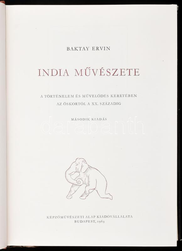Baktay Ervin: India művészete. A történelem és művelődés keretében az őskortól a XX. századig. Bp., 1963, Képzőművészeti Alap. Második kiadás. Gazdag képanyaggal illusztrálva. Kiadói aranyozott egészvászon-kötés, sérült kiadói papír védőborítóban.