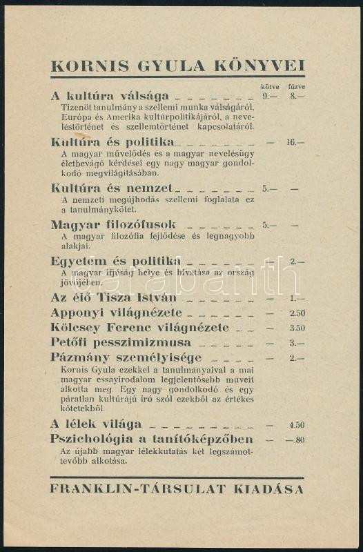 Beschreibung: Kornis Gyula: Az irodalmi műveltség értéke. Bp.,én.,Franklin, 24 p. Kiadói papírkötés. +Kornis Gyula könyvei prospektussal
