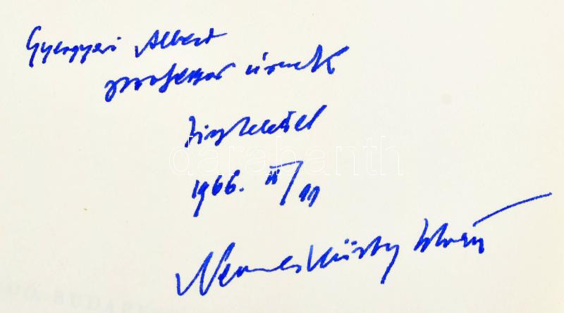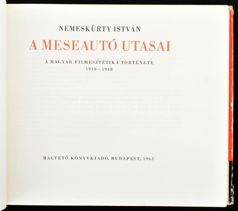 Nemeskürty István: A Meseautó utasai. A magyar filmesztétika története 1930-1948. A szerző, Nemeskürty István (1925-2015) író, irodalom- és filmtörténész által Gyergyai Albert (1893-1981) magyar irodalomtörténész, egyetemi tanár, írónak DEDIKÁLT! Bp., 1965, Magvető. Kiadói kartonált papírkötésben, kiadói szaladt, részben javított papírborítóban, a papírborító egy helyen összeragadt a kötéstáblával.