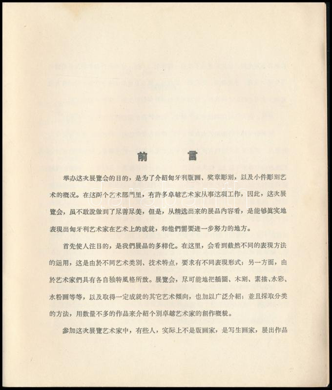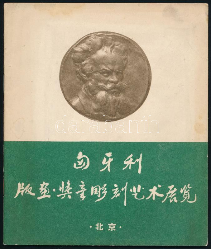 cca 1959 Magyar képzőművészeti alkotásokat (plakettek, grafikák, metszetek) bemutató, kínai nyelvű kiállítási katalógus. Fekete-fehér képekkel illusztrálva. Tűzött papírkötés, kissé foltos borítóval, 28 p. / Hungarian art exhibition catalogue, in Chinese language