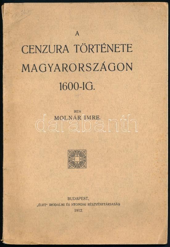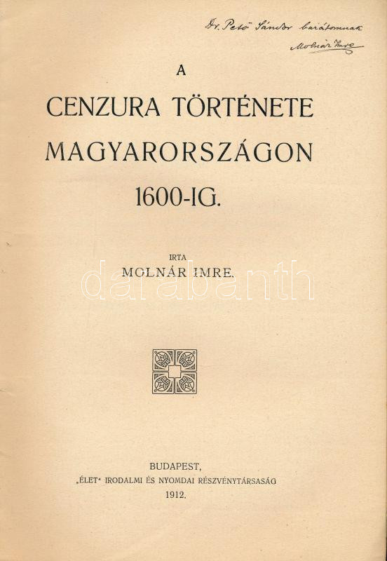 Molnár Imre: A cenzura története Magyarországon 1600-ig. A szerző, Molnár Imre által DEDIKÁLT példány. Bp., 1912, "Élet", 70 p. Kiadói papírkötés, a gerincen kis szakadással.
