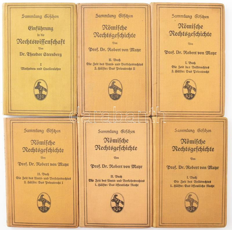 Samlung Göschen 6 kötete (577-578,645-646-647, 169) Robert von Mayr: Römische Rechtsgeschichte I. 1-2., II. 1., II. 2. I-II. I. Buch: Die Zeit des Volksrechtes. 1. häfte: Das öffentlcihe Recht. 2. Häfte: Das Privatrecht. II. Buch: Die Zeit des Amts- und Verkehrsrechtes 1. Das öffentliche Recht, 2. Das Privatrecht I-II.; Theodor Sternberg: Einführung in die Rechtswiffenschaf. Erster Teil: Methoden- und Quellenlehre. Leipzig, 1912-1913, G. J. Göschen'sche Verlagshandlung. Német nyelven. Kiadói egészvászon-kötés.