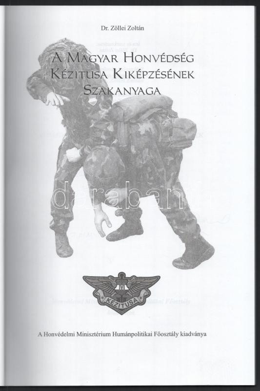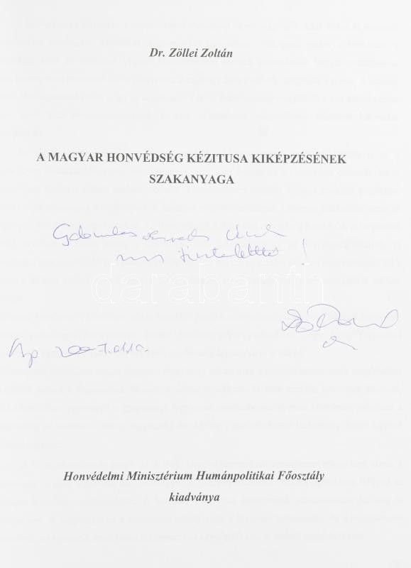 Dr. Zöllei Zoltán: A Magyar Honvédség kézitusa kiképzésének szakanyaga. H.n., é.n., Honvédelmi Minisztérium Humánpolitikai Főosztály, 101 p. Fekete-fehér képekkel illusztrált. Kiadói papírkötés. A szerző által DEDIKÁLT példány.