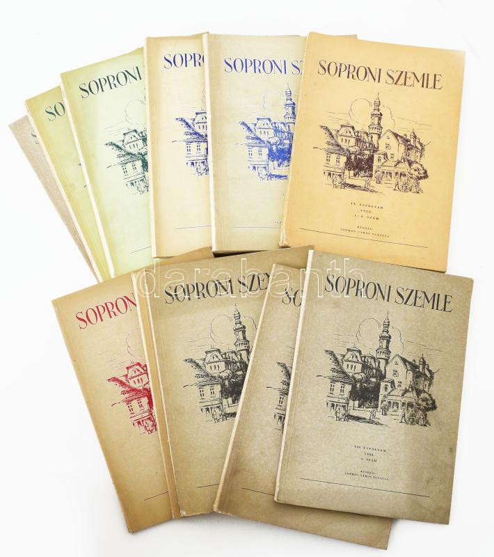 1955-1959 Soproni Szemle helytörténeti folyóirat össz. 11 db száma: IX. évf. (1955.) 1-2. sz.; X. évf. (1956.) 1., 2. sz.; XI. évf. (1957.) 1-2., 3-4. sz.; XII. évf. (1958.) 1., 2., 3., 4. sz.; XIII. évf. (1959.) 3., 4. sz. Kiadja: Sopron Város Tanácsa. Kiadói papírkötés, vegyes állapotban.