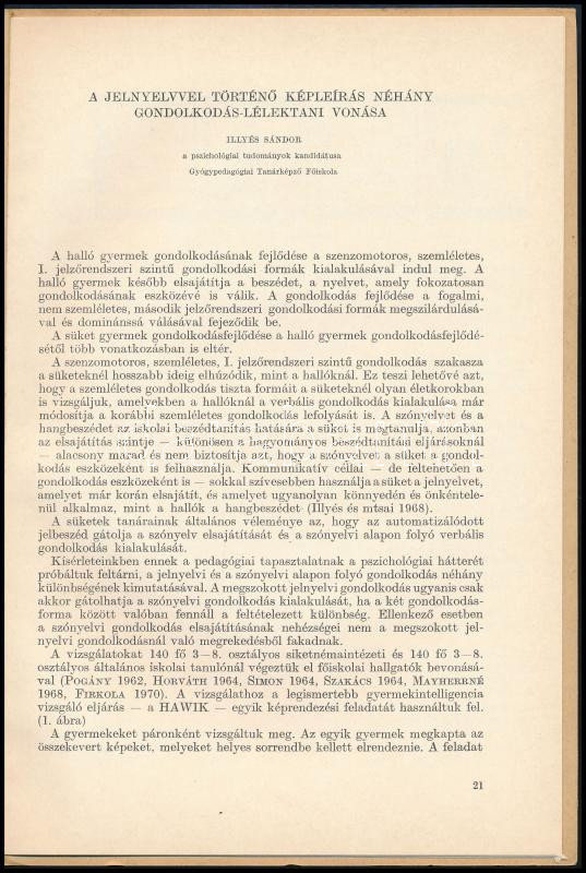 Illyés Sándor: A jelnyelvvel történő képleírás néhány gondolkodáslélektani vonása. Különlenyomat a Magyar Pszichológiai Szemle 1972. (XXIX. köt.) 1. számából. Bp., 1972, Akadémiai Nyomda, 21-25 p. Kiadói papírkötés.