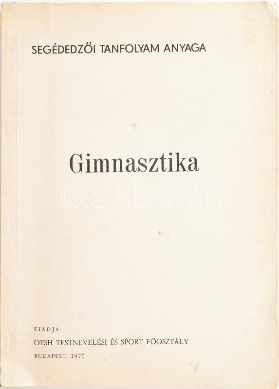 Kerezsi Endre: Gimnasztika. Segédedzői Tanfolyam Anyaga. Bp., 1976, OTSH Testnevelési és Sport Főosztály. 2. kiadás. Kiadói papírkötés, foltos borítóval, a gerincen kis szakadással.