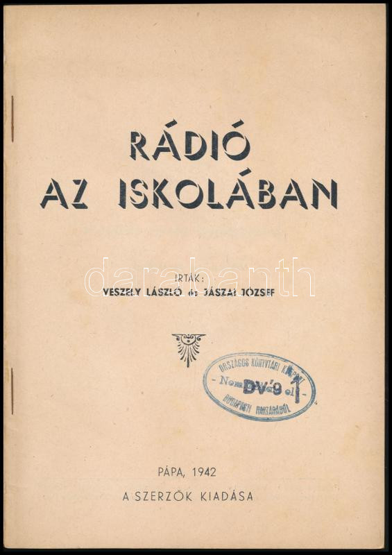 Veszely László - Jászai József: Rádió az iskolában. Pápa, 1942, a szerzők kiadása (Keresztény Nemzeti Nyomdavállalat Rt.), 79+(1) p. Kiadói illusztrált papírkötés, a hátsó borító foltos, a címlapon intézményi bélyegzővel, a borító belső oldalán beragasztott korabeli újságkivágással.