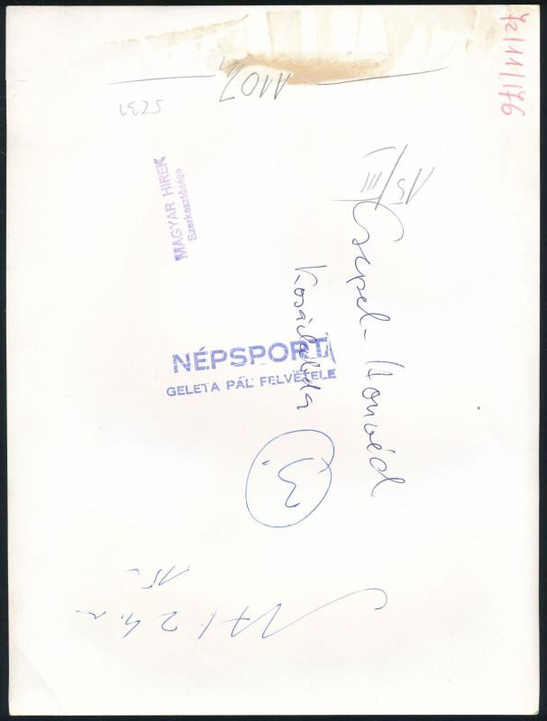 Beschreibung: 1972 Csepel-Honvéd kosárlabda mérkőzés, a lelátón Videoton reklámokkal, sajtófotó, a hátoldalon feliratozott, pecséttel jelzett, 24x18 cm