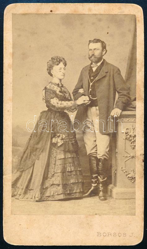 cca 1865-1870 Erdőtelki Kovács József (1832-1897) orvos- és sebészdoktor, miniszteri tanácsos, egyetemi rendes tanár és neje portréja, keményhátú fotó Borsos József pesti műterméből, vizitkártya, 10,5x6 cm