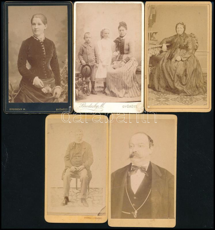 Beschreibung: cca 1870-1890 Győr, 5 db vizitkártya, Brodszky M., ill. Skopáll J. özvegye műterméből, 10,5x6,5 cm körül