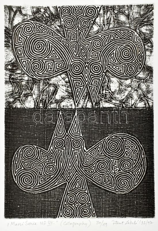Beschreibung: Feszt László, ifj. (1957-): Maori Serie No. VI., '82/97. Kollográfia, papír, jelzett, számozott (30/19), hátoldalán a művész bélyegzőjével. 30×21 cm