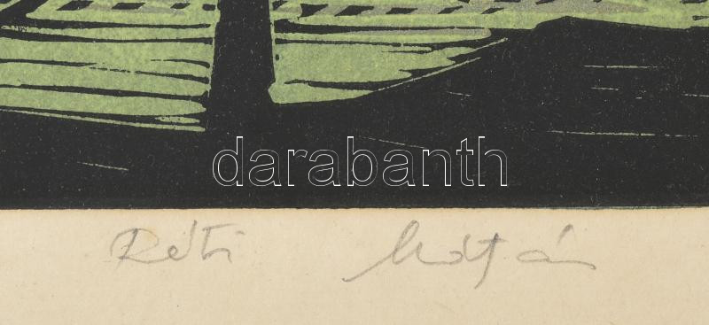 Beschreibung: Réti Mátyás (1922-2002): Győr. Színes linómetszet, papír, jelzett. Dekoratív, üvegezett, kissé sérült fakeretben, 27×38 cm