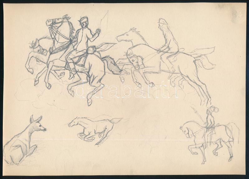 Tóth Gyula (1891-1970), 3 db mű: Lovas és katonai témájú rajzok. Ceruza, papír, jelzés nélkül, egy további lapon a művész autográf aláírásával, 27x19 cm