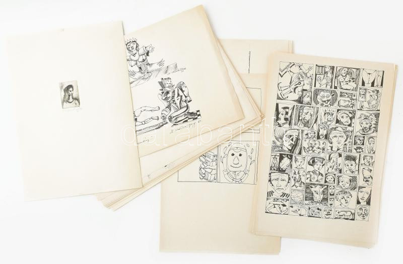 Zé Kovács József (1951- ): 53 db illusztráció (közte akt is). Nyomat, papír, részben jelzett, lapméret: 20x31 cm körül + Hölgyportré (Edit). Rézkarc, papír. Jelzett, számozott (9/100). 5x3 cm