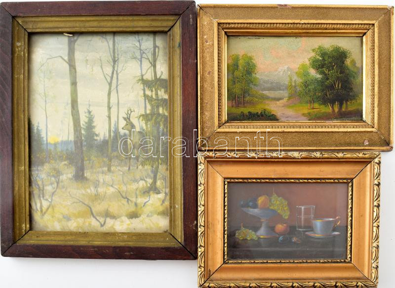 Beschreibung: 3 db csendélet és erdei jelenet. XIX. sz, XX. sz eleje. . olaj, vászon, olaj, fa, akvarell XIX. sz. kissé sérült fa keretekben 14x10 cm, 26x20 cm