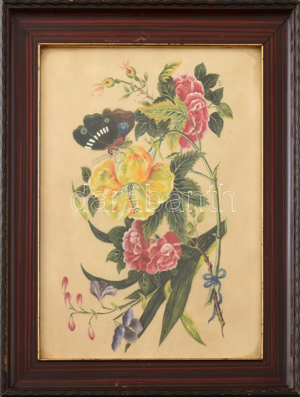 Beschreibung: D.F. jelzéssel: Virágok pillangóval. Akvarell, selyem. Dekoratív, üvegezett fakeretben. 24x32 cm