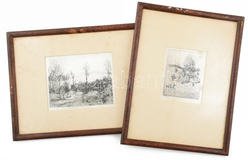 Olvashatatlan jelzéssel: 2 db I. világháborús életkép osztrák-magyar katonákkal. Rézkarc, papír. Paszpartuban, üvegezett fakeretben, 15x12 cm és 16,5x20,5 cm