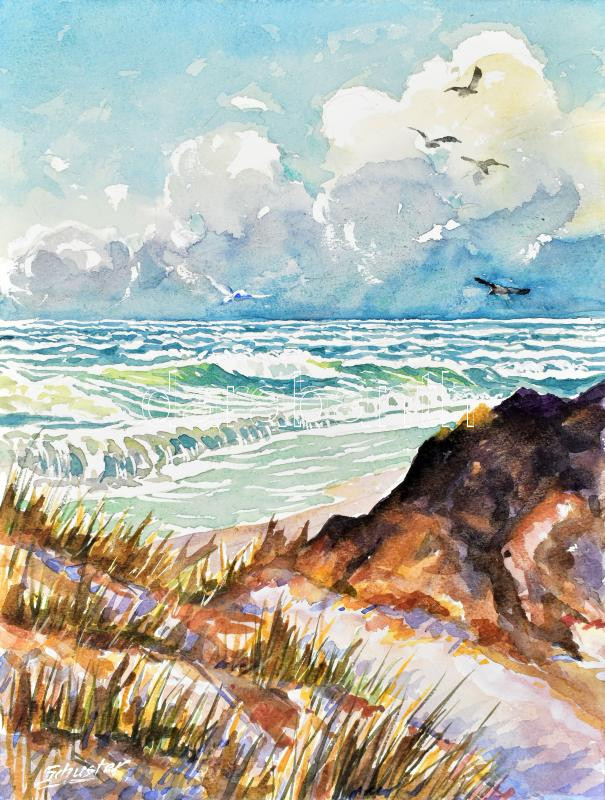 Beschreibung: Schuster jelzéssel: Tengerparti dűnék. Akvarell, papír. Kartonra kasírozva. 32x24 cm