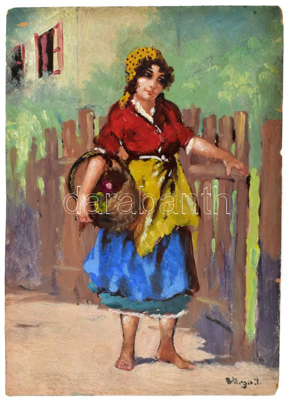 Varga I jelzéssel: Menyecske. Olaj, karton, szélén kissé sérült. 35x25... https://www.darabanth.com/de/454-Fernauktion/454.0/Gemalde-und-Grafiken/Gemalde-und-Graphic-quot-signiertquot-quot-ohne-Signquot-~500002/Varga-I-jelzessel-Menyecske-Olaj-karton-szelen-kisse-serult-35x25-cm~II2988951
