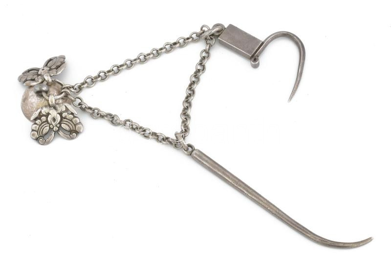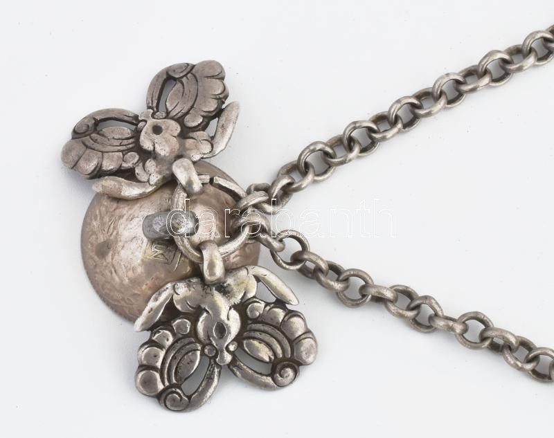Beschreibung: Ezüst(Ag) tradicionális mongol dohányzókészlet (hiányos), 2 db + 3 db dísz láncon, nettó: 159,8 g