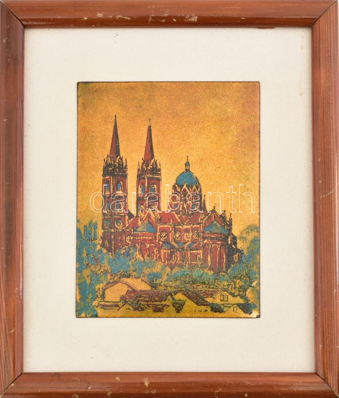 Beschreibung: Marija Kalajzic: Diakovári / Dakovói székesegyház. Tűzzománc, rézlemez. Jelzett, sorszámozott. keretben. Külső méret 19x21 cm