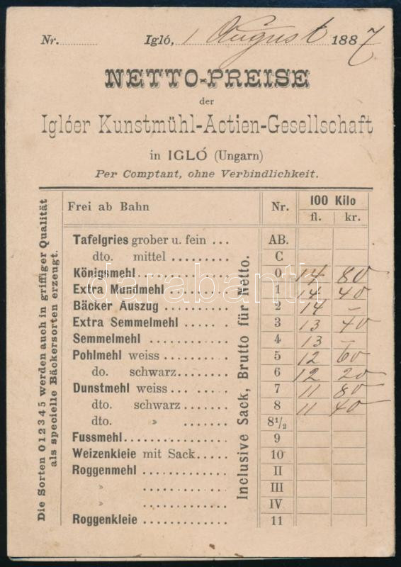 Beschreibung: 1887 Netto-Preise der Iglóer Kunstmühl-Actien-Gesellschaft - Az iglói Műmalom készítményeinek árjegyzéke, hátoldalon a malom képével