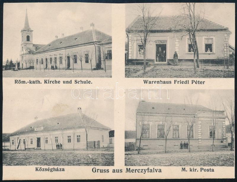 1900 Erdély Mercyfalva, Merczyfalva, Merczifalva, Carani, Mertisoara; / Községháza, Templom, Iskola, Friedl Péter üzlete, posta körbevágott képeslap / town hall, church, school, shops, post cut postcard. 11,5x8,5 cm