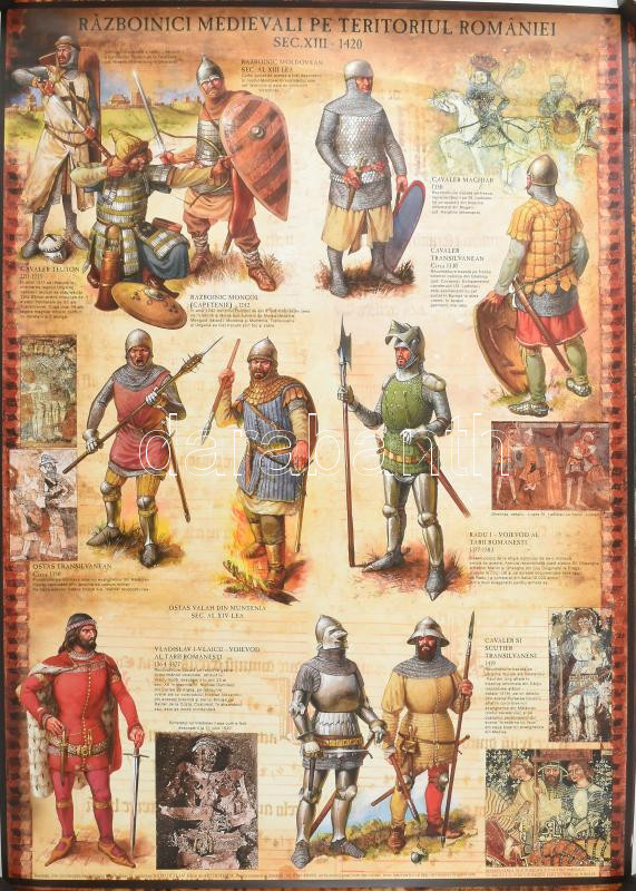 2 db román történelmi poszter (középkori harcosok, lovagok, fejedelmek), színes illusztrációkkal, román nyelven, feltekerve, 68x48 cm körül / Romanian historical posters (Medieval warriors, knights, lords), 2 pcs, in Romanian language
