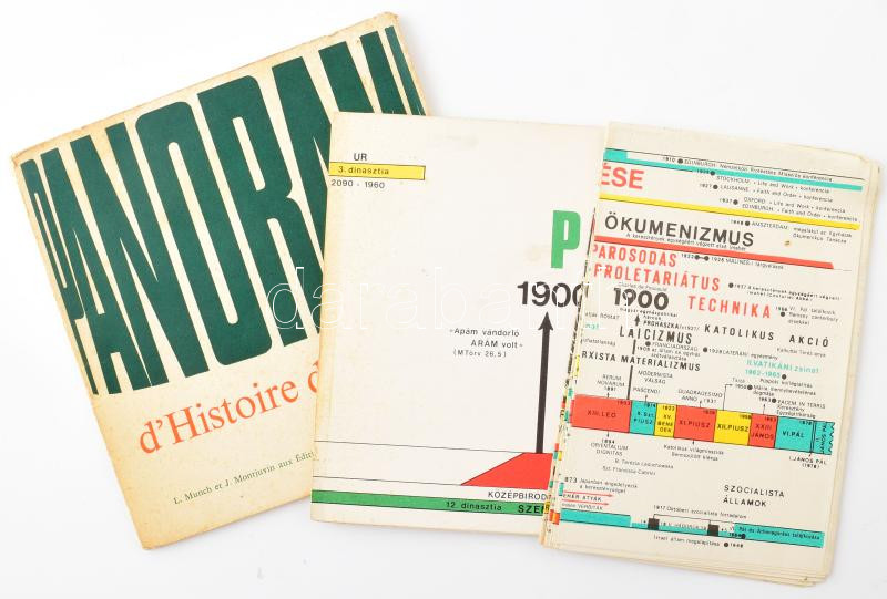 Beschreibung: 3 db grafikus történelmi áttekintő táblázat, két magyar és egy francia nyelvű, változó méretben és állapotban