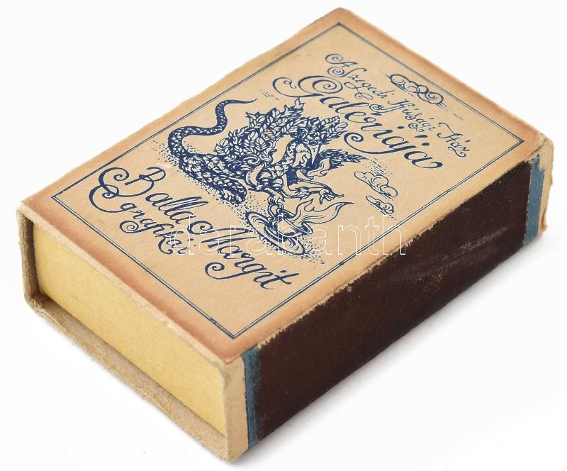 Beschreibung: Balla Margit grafikus 1979 szept. 17-i Szegedi Ifjúsági Házban rendezett kiállításának reklámanyag gyufásdoboza, kopással, üres