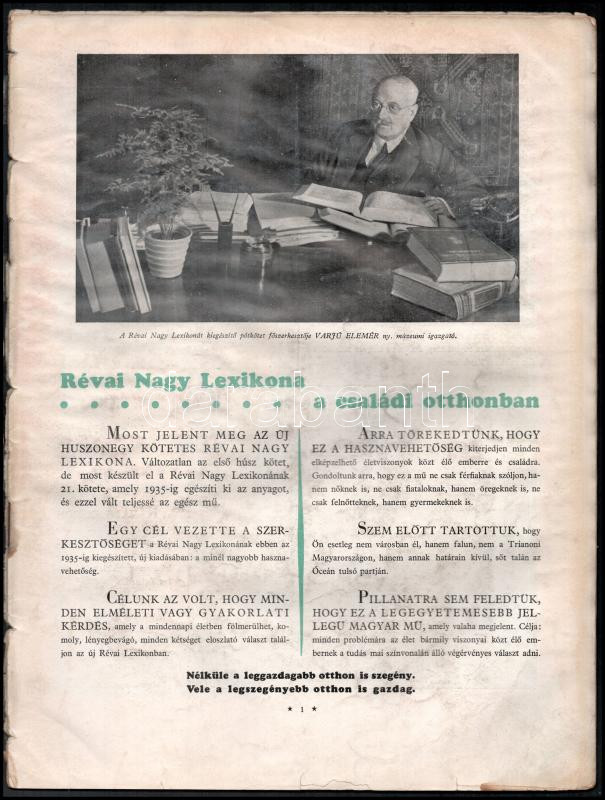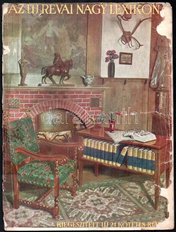 cca 1935-1940 Az új Révai Nagy Lexikon. Fekete-fehér és színes képekkel gazdagon illusztrált ismertető kiadvány. Bp., Révai-ny., 32 p. Kiadói tűzött papírkötés, sérült, viseltes állapotban, különvált borítóval.
