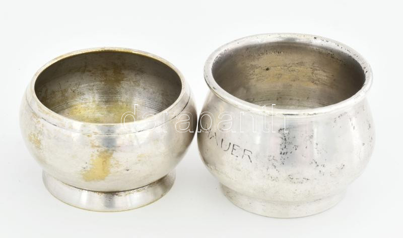 Beschreibung: 2 darab antik ezüstözött alpakka fűszertartó, egyik alján Hauer felirattal, kopással, m: 4-5 cm