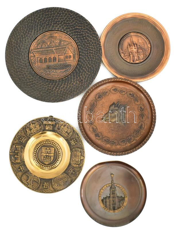 Beschreibung: 5 db réz dísztányér, városnevesek: Budapest, Kaposvár, Badacsony, vaddisznó fej. 18-26 cm-ig