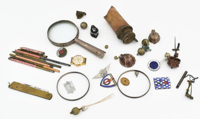 Beschreibung: Doboznyi kisebb bolha tétel, közte érdekes darabokkal: bicska, lupé, ruhadísz, kitüntetések, tajtékpipa szerelékek, nagyító, óra, stb.