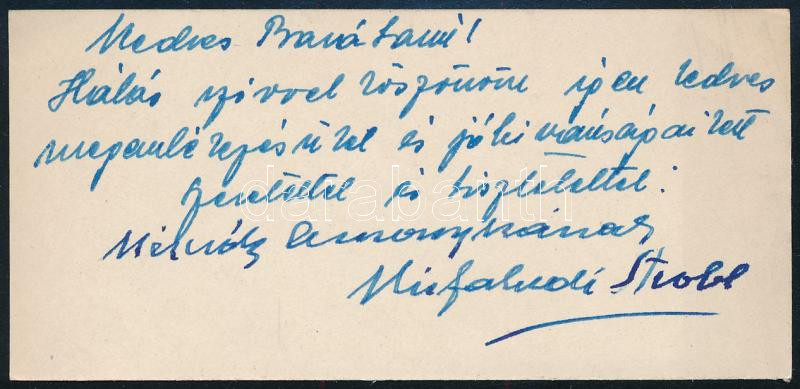 1950-1970 Kisfaludi Strobl Zsigmond (1884-1975) szobrászművész saját kezű köszönetnyilvánító sorai ismeretlen személy részére, saját kezű aláírással.
