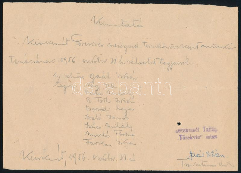 1956 október 31. Kimutatás a Kecskemét Törekvés mgtsz munkástanácsának üléséről aláírásokkal, pecséttel a forradalom napjaiból, kézzel írva. Reprodukálva: Balai F. István -Lovas Dániel: Kecskemét '56/60. .